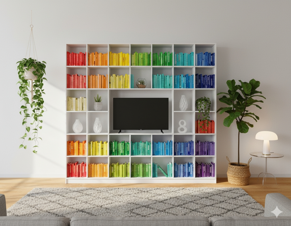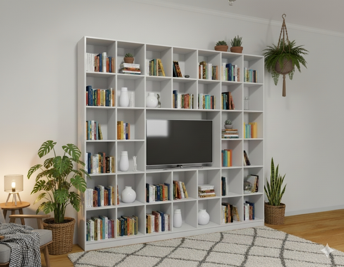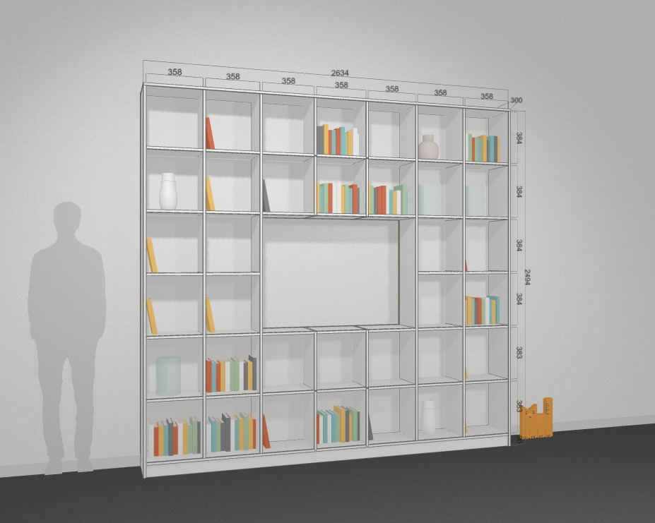 Наш клиент хотел высокий, широкий шкаф от пола почти до потолка с квадратными ячейками для книг, декора и других вещей. При этом комната имела ограниченные размеры по ширине и высоте, а в центре необходимо было разместить телевизор. Обычно такие проекты требуют долгих походов по магазинам, общения с дизайнерами и мастерами — это занимает много времени и нервов.