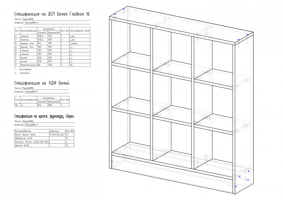 - все полки и перегородки становятся съёмными. Это немного дороже за счёт замены крепежа на разборный, но сильно упрощает монтаж. Сначала собирается корпус шкафа вертикально. А полки и перегородки устанавливаются после сборки корпуса.