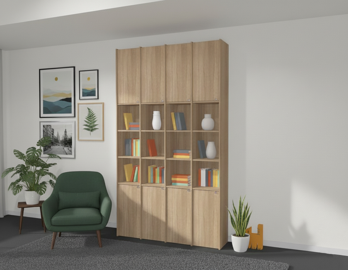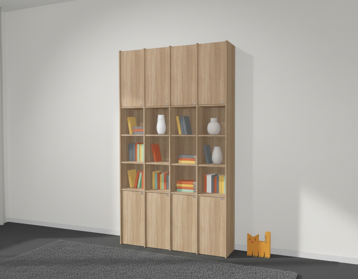 Полуоткрытый стеллаж с утопленными дверками — стильное и функциональное решение, сочетающее открытые полки и скрытые отделения. Идеален для хранения и украшения интерьера.
