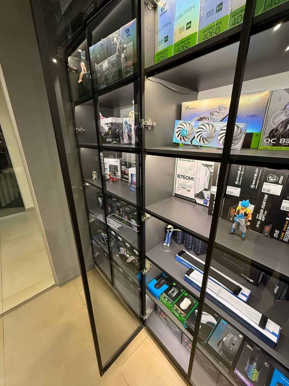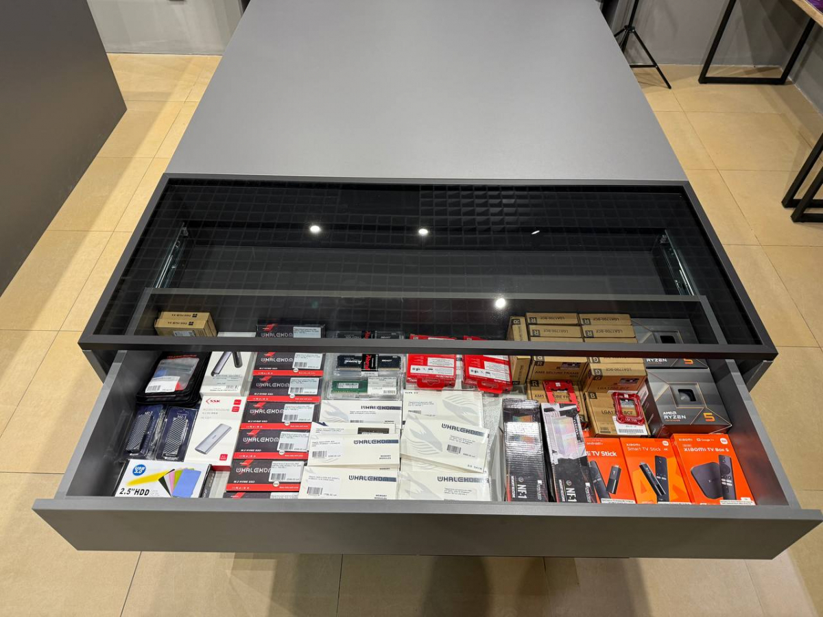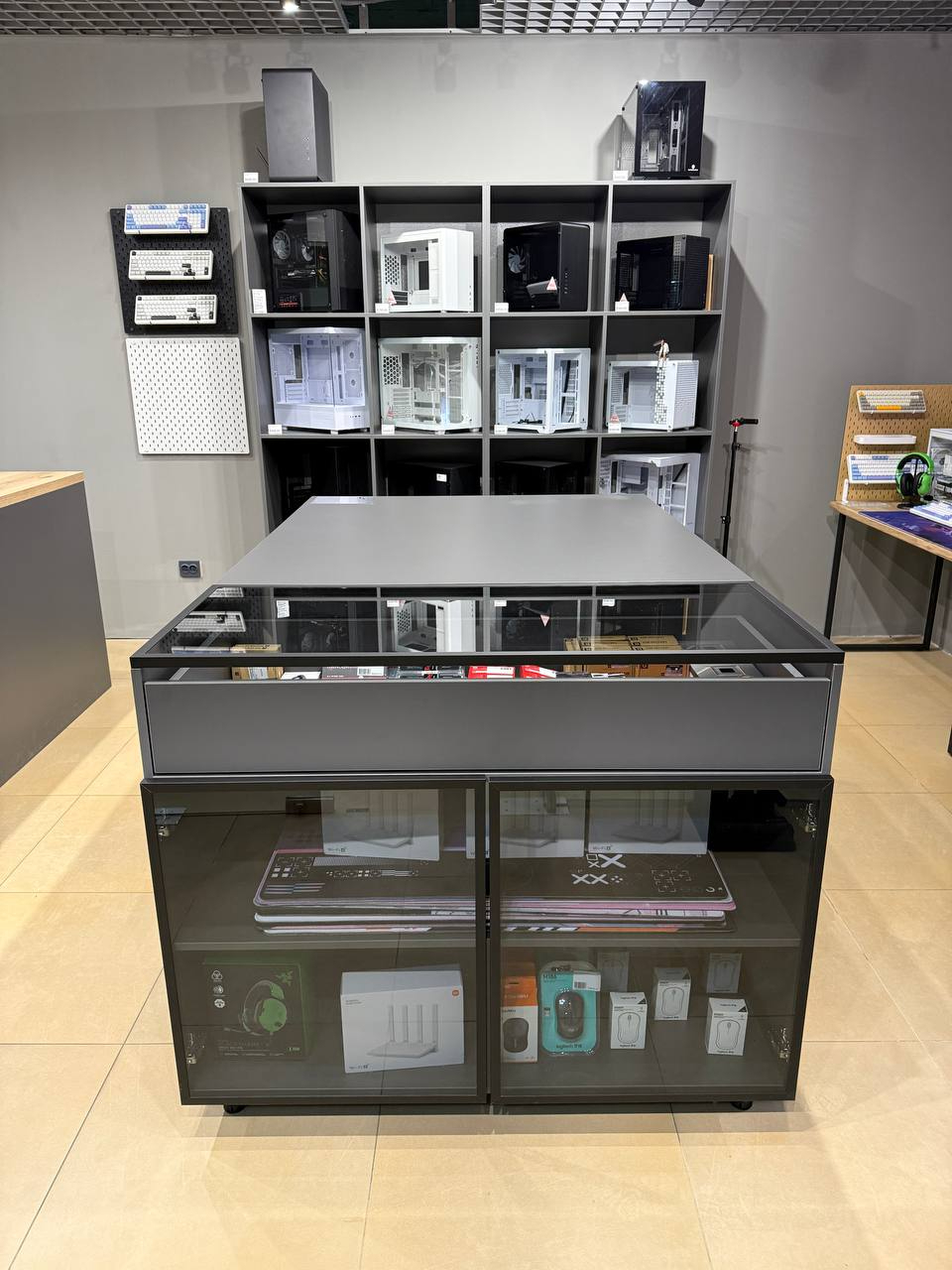 Этот проект немного выбивается из других примеров в нашем разделе, потому что клиент не просто спроектировал мебель, а серьезно доработал модели, созданные в нашем онлайн конструкторе. Но, как ни удивительно, все, что вы видите на фотографии, стеллажи, центральная тумба, кассовая зона, было сделано именно через наш конструктор.