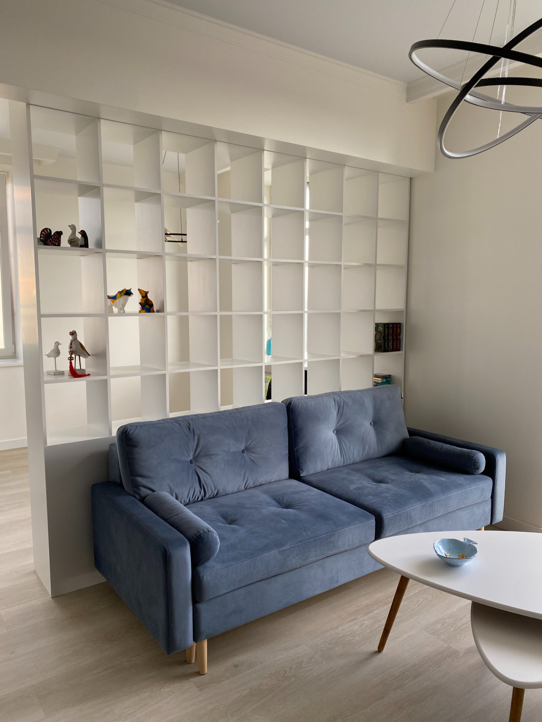 Клиент хотел разделить большую комнату на две части — гостиную и рабочую зону. Нужно было сохранить свет и ощущение пространства, но при этом добавить место для хранения. Идеей стало сделать шкаф-перегородку от пола до потолка, от стены до стены, который встанет за диваном и станет частью интерьера.