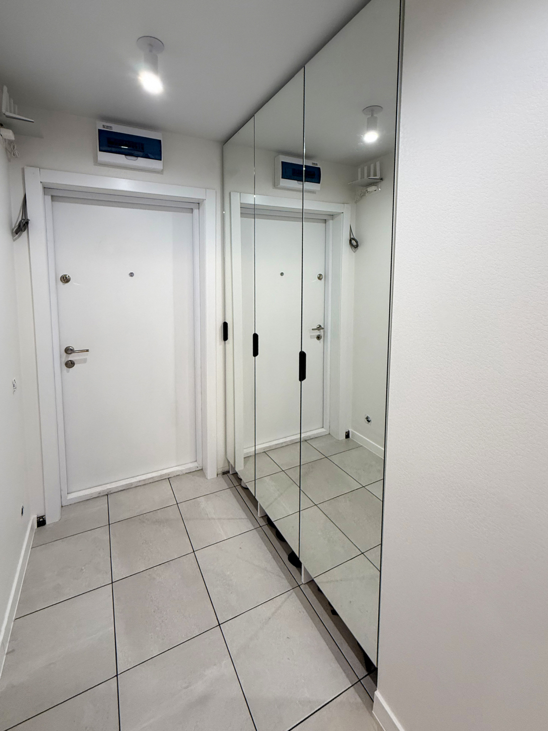 К нам обратился клиент из типовой московской квартиры известного застройщика из трёх букв. Он хотел сделать большой шкаф с зеркальными фасадами, который идеально вписывался бы в нишу. При этом под шкафом хотелось сохранить пространство для хранения обуви.