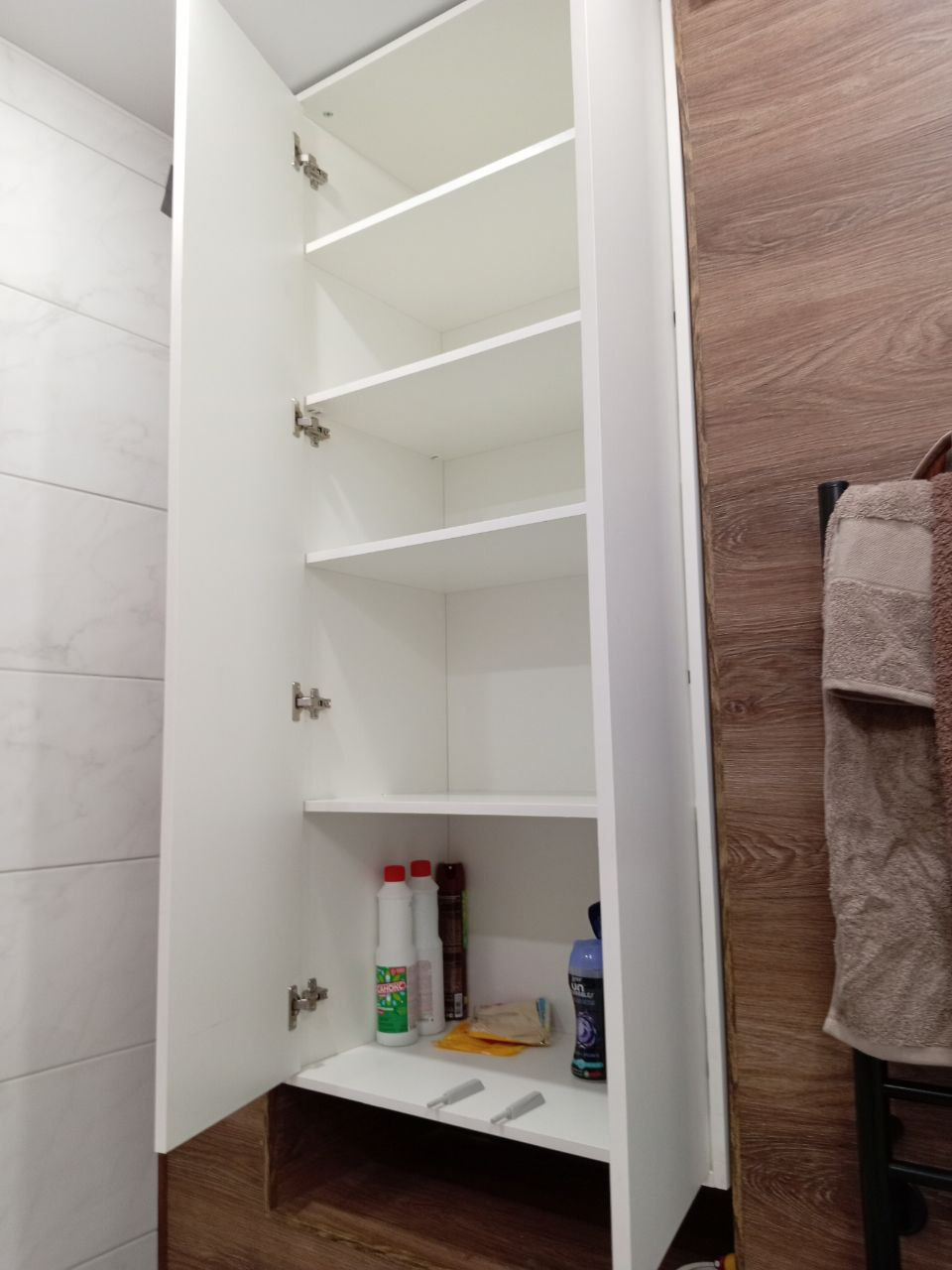Получился аккуратный и функциональный шкафчик, который идеально вписался в интерьер ванной комнаты. При этом не нужно было никуда идти, ехать или общаться. Всё сделано удалённо и при этом по индивидуальному заказу Клиент остался доволен результатом, а нам идея понравилась настолько, что мы добавили этот вариант в каталог.