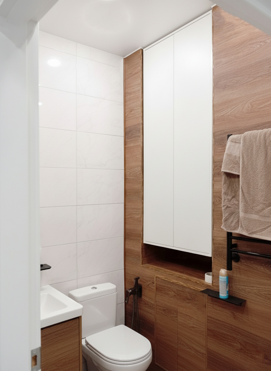 К нам обратился клиент с популярной задачей сделать шкафчик в нишу в ванной комнате. Такие ниши часто появляются там, где проходят коммуникации: над унитазом, над инсталляцией или возле раковины. У клиента ниша была предусмотрена заранее во время ремонта, и в неё нужно было аккуратно вписать шкафчик. Сложность заключалась в том, что ниши почти всегда нестандартные по размерам, а мебельщики обычно не хотят браться за такие небольшие заказы, так как это требует много внимания и точности.