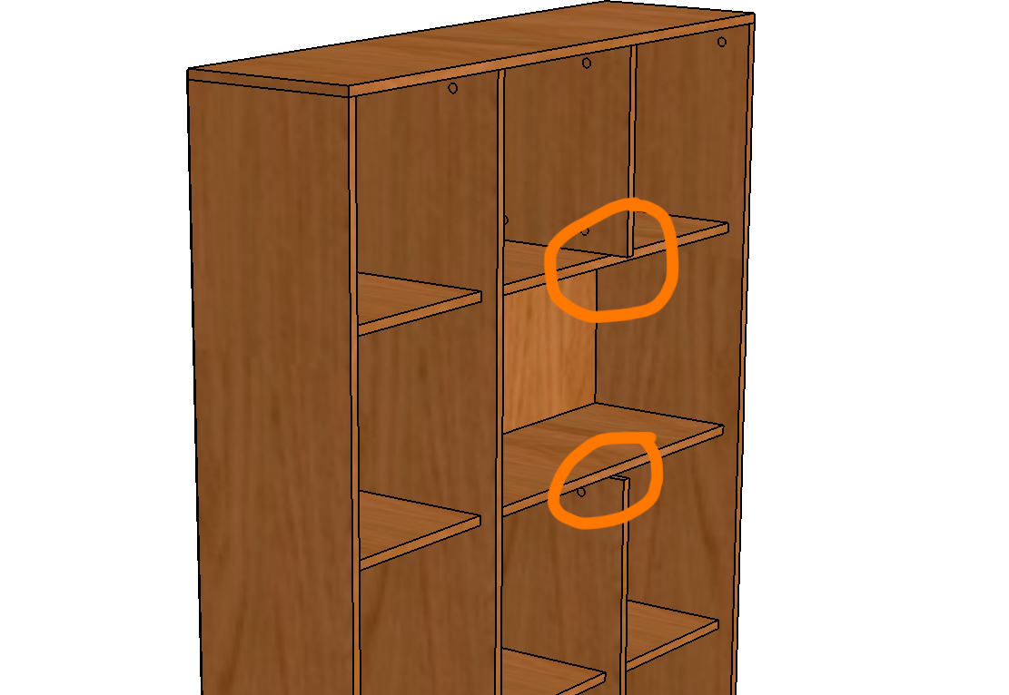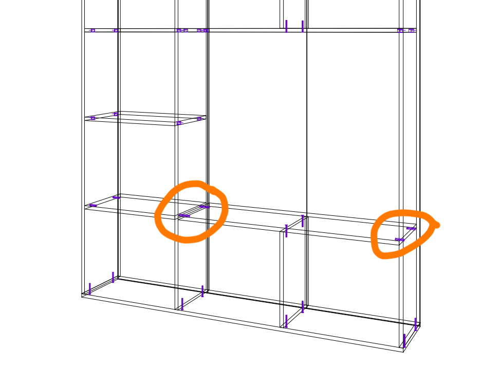 Пока этот момент не автоматизирован, рекомендуем вручную выбирать в конструкторе опцию «все полки съёмные». Это немного дороже, так как стяжки стоят больше, чем шканты, но зато независимо от того, какие полки вы уберёте, стяжки в конструкции сохранятся.