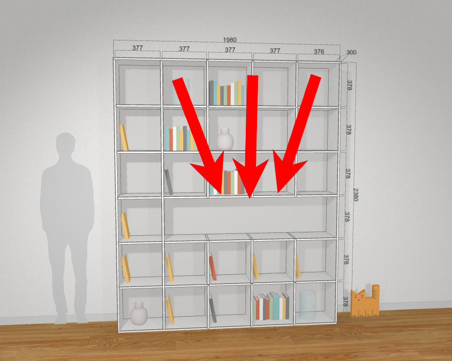 Может возникнуть ситуация, когда вы объединяете ячейки, а над получившейся широкой полкой остаются перегородки и полки. Они создают дополнительную нагрузку сверху. Это нужно учитывать ещё на стадии проектирования.