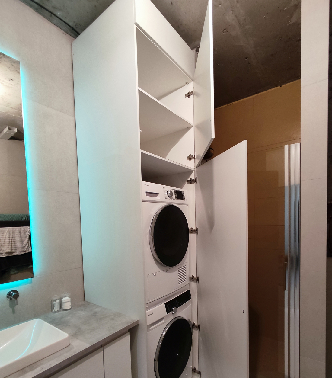 Шкаф для стиральной и сушильной машины, установленных в колонну. Конструкция без дна, с фасадами, полностью закрывающими технику и создающими визуальный порядок.