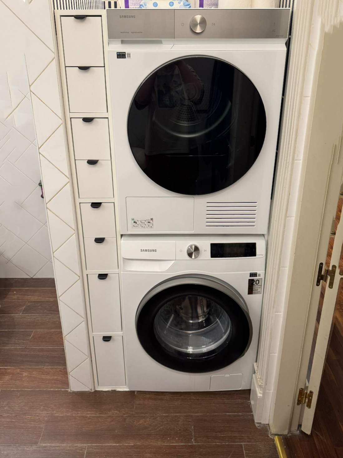 Высокий узкий шкафчик с выдвижными ящиками для бытовой химии, по высоте как стиральная и сушильная машина в колонну. Он занимает свободное место сбоку и превращает его в удобное и аккуратное хранение.