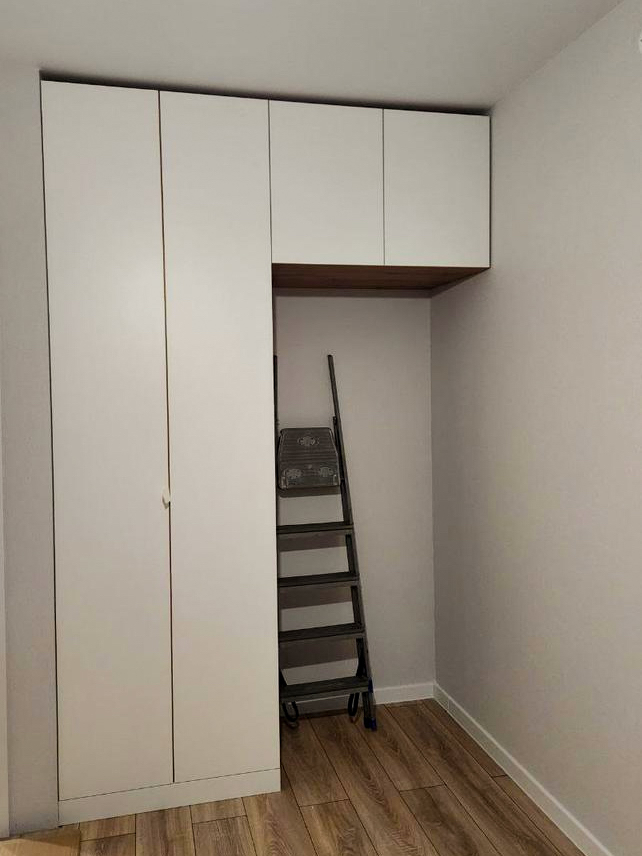 При этом клиент специально оставил небольшой зазор от стены и потолка - для подстраховки при установке. В целом его можно было сделать и меньше, но многие выбирают такой вариант, чтобы избежать риска, что шкаф не встанет из-за неровностей стен или потолка. Это один из самых частых страхов при проектировании мебели.