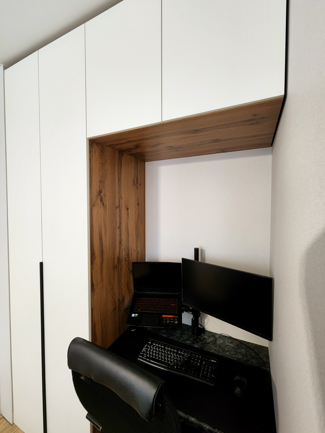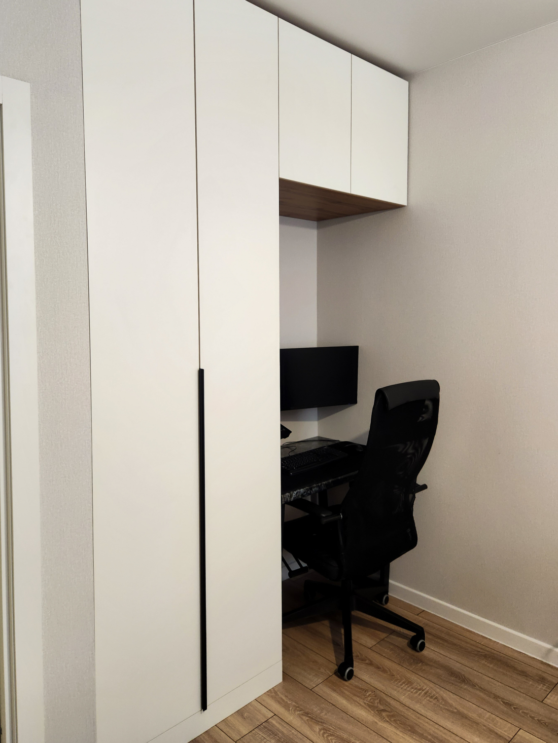 У клиента уже был рабочий стол, поэтому правый модуль подбирался точно под его ширину, а левый шкаф - в оставшееся пространство. Так вся композиция выглядит цельной и аккуратной.