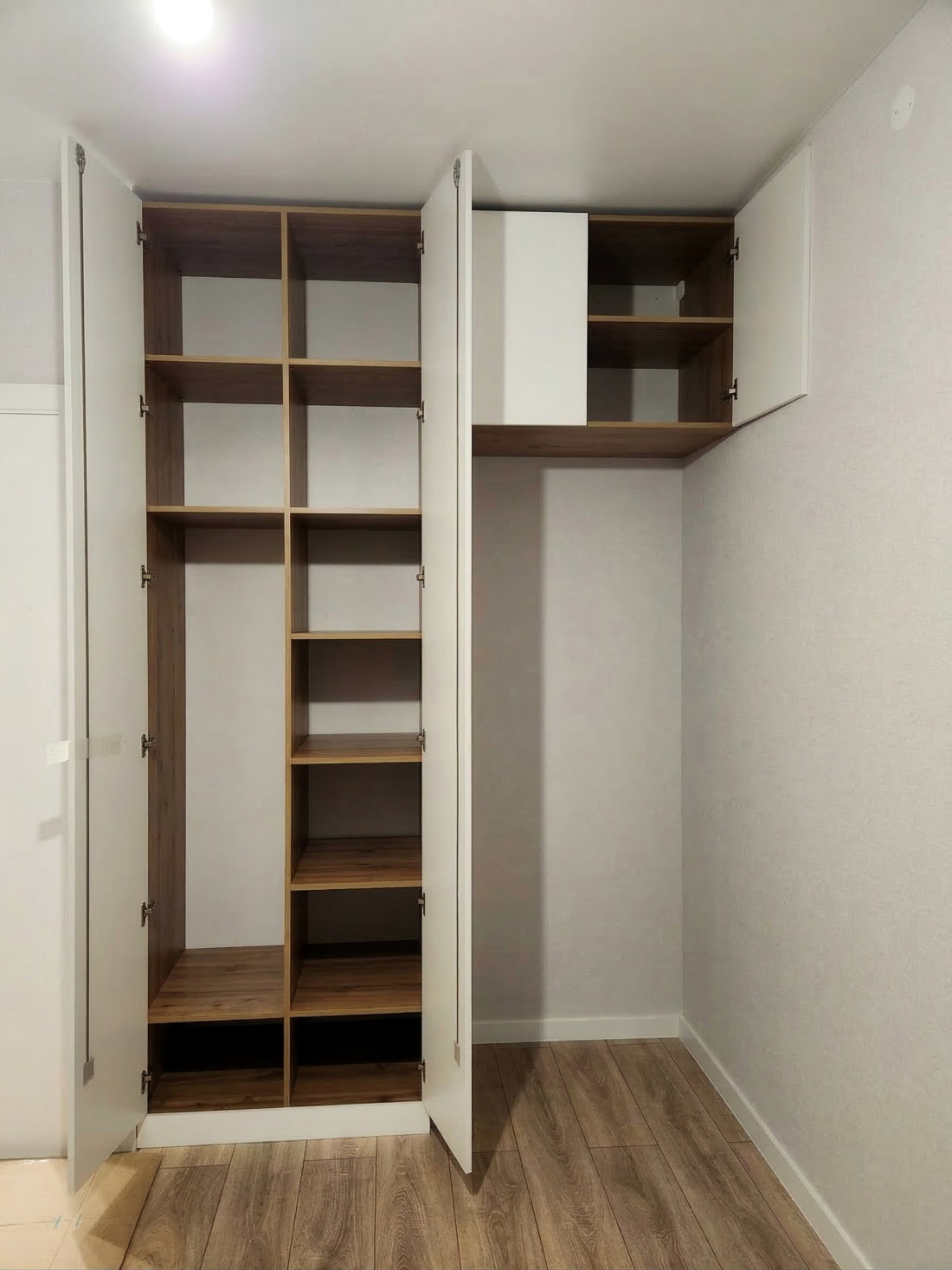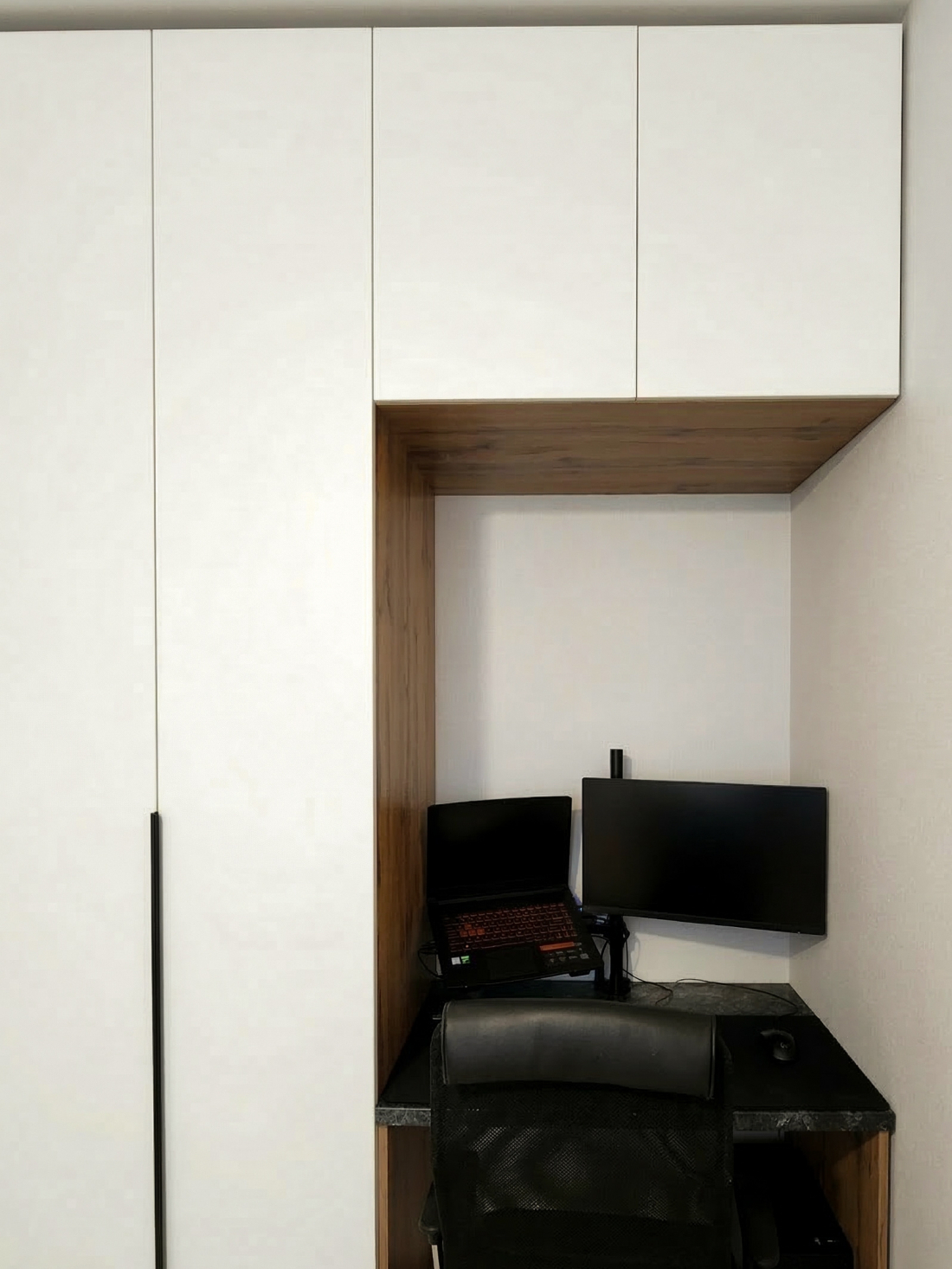 Корпус шкафа сделан в цвете «Дуб Вотан», а фасады - из белого ЛДСП. Такое контрастное сочетание выполняет сразу несколько функций: благодаря белому цвету шкафы идеально вписываются в интерьер, а тёмный корпус соединяет чёрный стол (который уже был у нашего клиента) со светлыми стенами. Вытянутые ручки клиент заказал сам на маркетплейсе. Наполнение шкафа сделано в соответствии с запросами клиента.