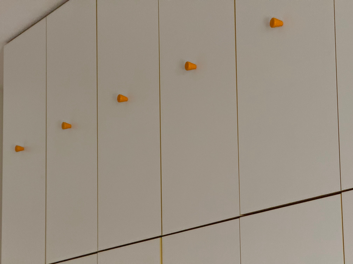 Вместительный шкаф, который впишется практически в любое (даже самое маленькое) пространство. Большие секции для хранения верхней одежды, маленькие - для аксессуаров и других необходимых мелочей. Узкие дверцы, которые не только экономят пространство, но и создают тонкий ритм пространства. Игривые ручки, установленные в нестандартном положении - по центру.