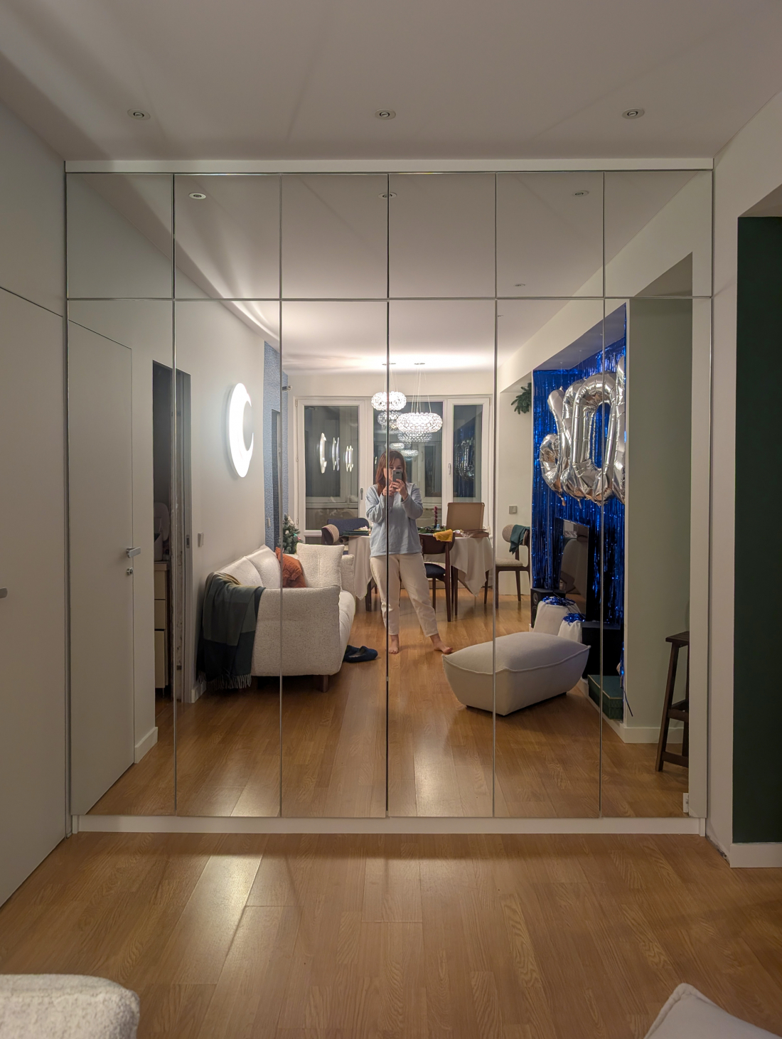 Когда есть своё виденье, грамотный сборщик и удобный мебельный конструктор - любые эксперименты будут вам ни по чём! Наша клиентка Мария задумала вместительный встроенный шкаф от пола до потолка, да ещё с зеркальными фасадами.