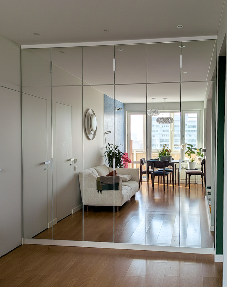Зеркальный гардеробный шкаф от стены до стены, от пола до потолка