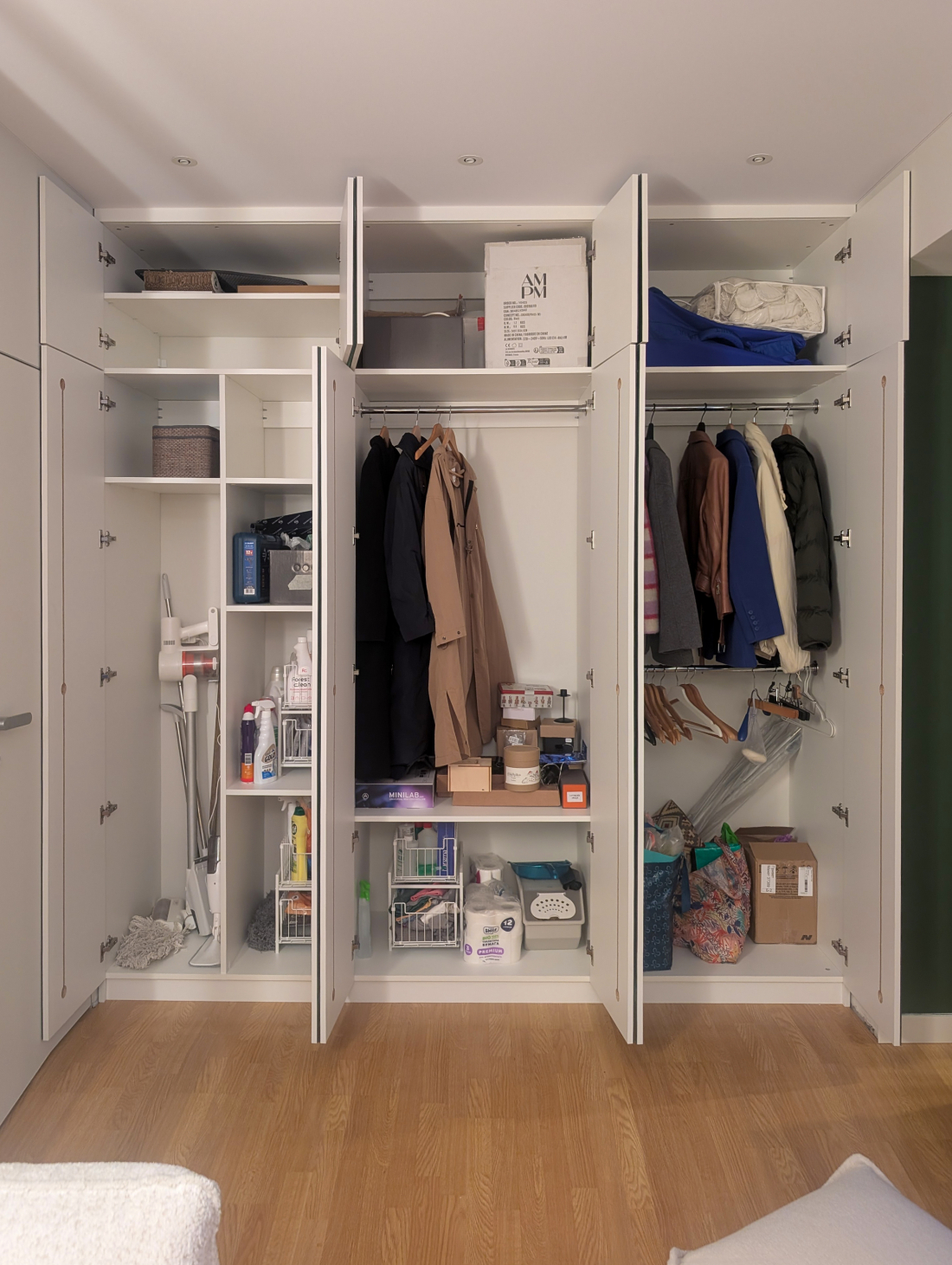 Так как клиентка планировала использовать шкаф как для одежды, так и для различных бытовых приборов - в каждой секции выбрано индивидуальное наполнение, а некоторые ячейки объединены.